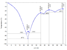 如下圖所示,鹽酸共有四個結晶的共熔點,分別對應四種晶體:68%(HCl的質量分數,下同)時的HCl·H2O、51%時的HCl·2H2O、41%時的HCl·3H2O和25%時的HCl·6H2O。另外在24.8%時還有一種亞穩的HCl·3H2O生成。